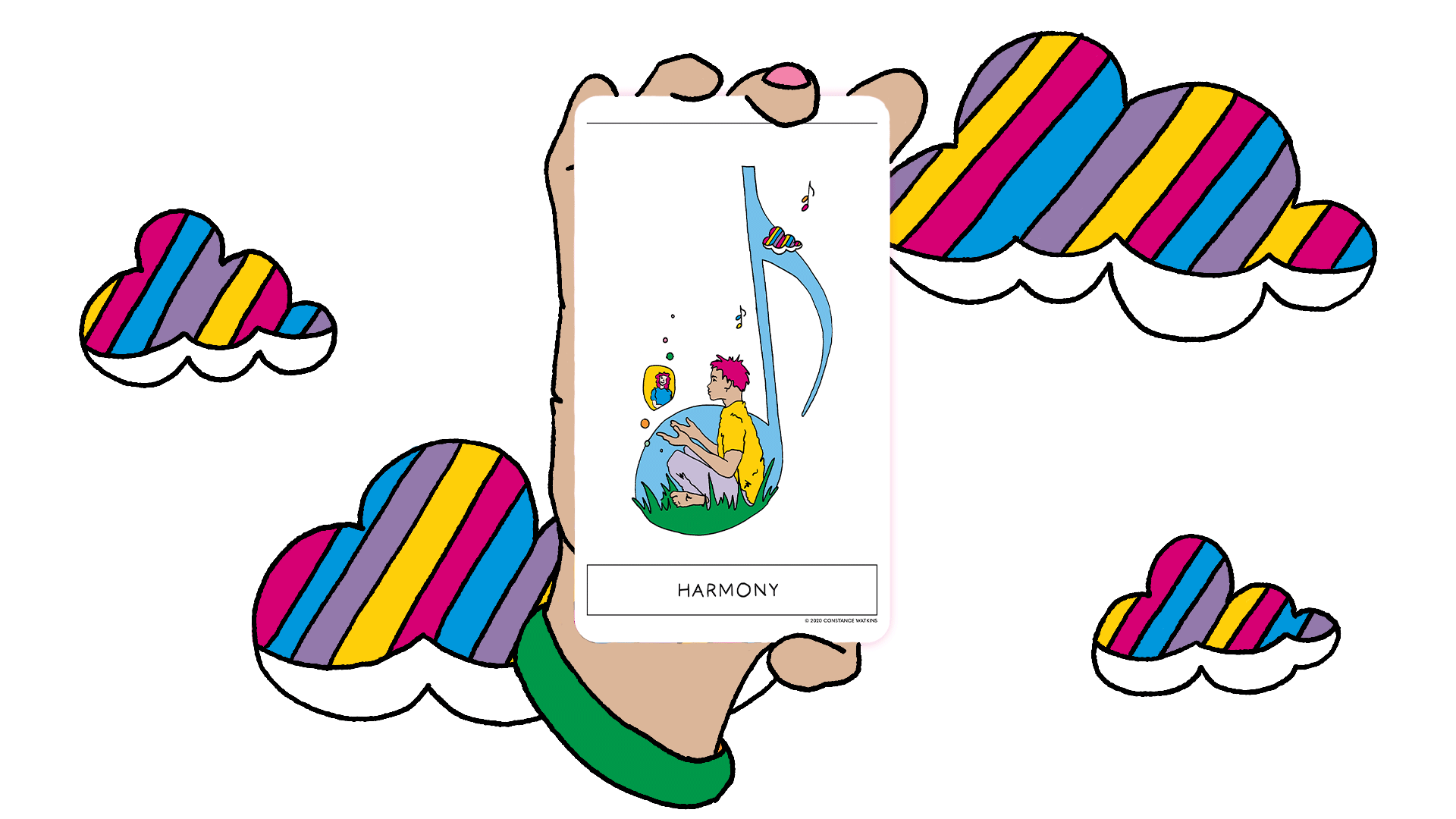 Harmony, a new 79th card exclusive to the second edition, is a card of staying connected. Feel the music as the breeze ruffles your hair or when your toes touch the grass. Even from a distance, we are all connected. Harmony is being attuned with the world around you. Not necessarily walking in lock step, but complimenting each other’s moves nonetheless. Even if we feel isolated or distanced from those we love and the places that we used to roam, this distance doesn’t have to create solitude. We can still be in harmony though our paths may diverge.